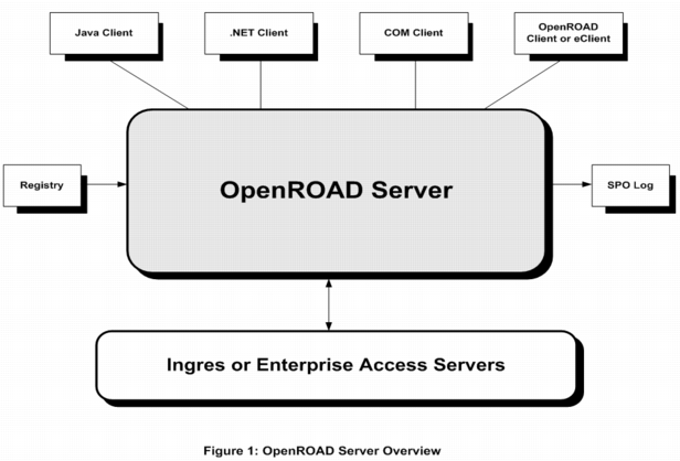 The following figure is a high-level conceptual view of the OpenROAD Server and the components with which it interacts. This figure generally represents the level of detail that a programmer needs to conceptualize the OpenROAD Server.