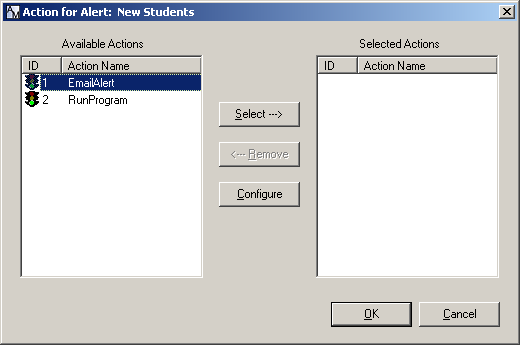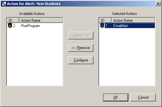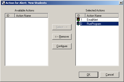1 If the Alerts window is not open, select File Alerts, select the alert to configure, click the Action button, click RunProgram, and click the Select button.The RunProgram action moves to the Selected Actions column.
