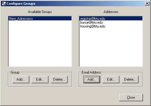 9 In this window you can manage email groups and addresses, as described in the following table. When you are finished, click OK to return to the Configure EmailAlert window.