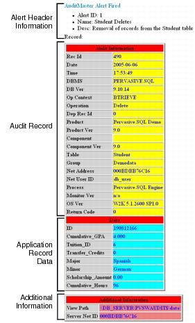 Select a group name, click Delete Group, and click Yes to confirm. The group is deleted only for this alert and remains in the system for use in other alerts. With a group selected, select an address from the list of email addresses for that group, then click Edit E-mail, enter a new email address, and click OK. With a group selected, select an email address, click Remove E-mail Address, and click Yes to confirm.The following sample email alert was tripped by an insert in the Demodata database. If AuditMaster monitors a database without a schema, the application record data in the alert does not display the hexadecimal content. If the schema has been imported, then column names are displayed.Figure 7-5 Structure of an Email Alert