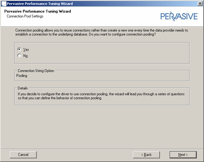 To create a new connection, select Tools / Pervasive / Run Pervasive Performance Tuning Wizard.... When the Performance Tuning Wizard Welcome dialog appears, click Next. Continue at Step 2.
