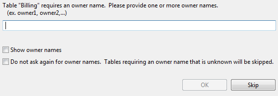 You can omit providing an owner name for a specific table with the Skip button. To skip all tables with an owner name, select Do not ask again for owner names. Tables requiring an owner name that is unknown will be skipped then click Skip.