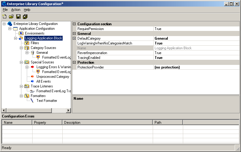 Right-click Application Configuration, then select New > Logging Application Block. The Configuration section appears in the right pane.