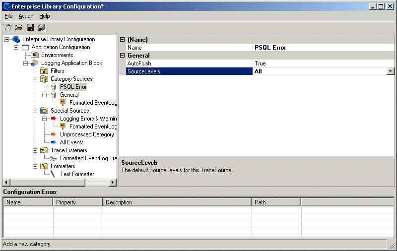 Right-click the new category and select New > TraceListener Reference. A Formatted EventLog TraceListener node is added. From the ReferencedTraceListener drop-down list, select Formatted EventLog TraceListener.