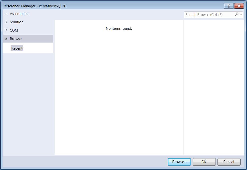 Select Pervasive.Data.SqlClient.dll and click Add. The Browse tab of the Reference Manager wizard lists the PSQL data provider assembly in the Recent items.