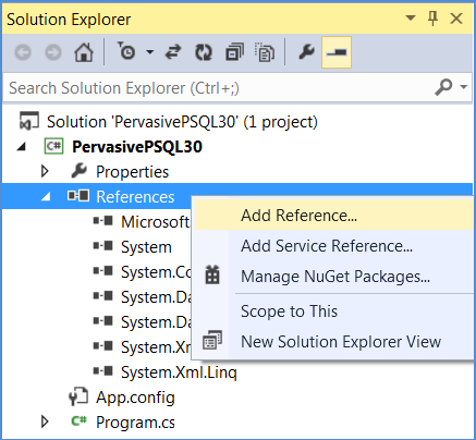 Select it and click OK. The Solution Explorer now includes the PSQL data provider.