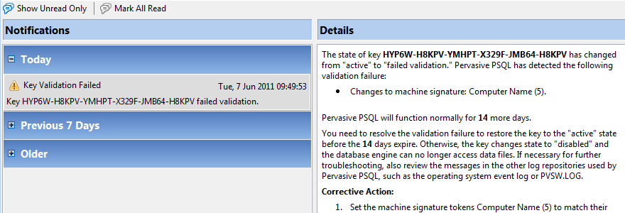 1Message logging follows a one-way hierarchy: any licensing message logged to Notification Viewer is also logged to the Operating System Event Log and to the PSQL Event Log. Similarly, any licensing message logged to the Operating System Event Log is also logged to the PSQL Event Log.