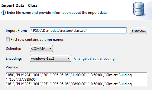Import Data now allows you to change file encoding and to set a default encoding. In addition, the Preview inset shows a preview of the data based on the file name, file encoding and the options selected. For example, the following image shows the class.sdf table provided with PSQL about to be imported.