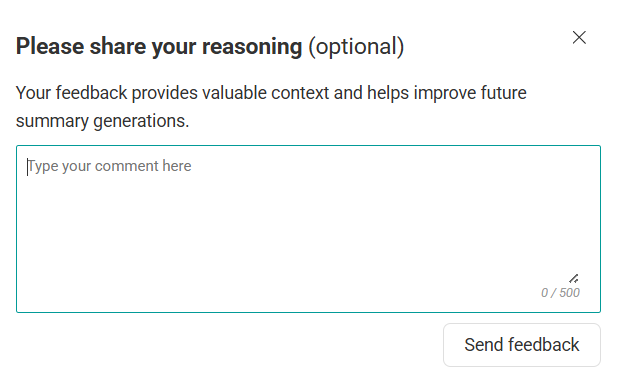 Select the thumbs-up or thumbs-down button to provide feedback on the AI-generated summary. This feature is disabled by default, but your Customer Success Manager can enable it upon request.