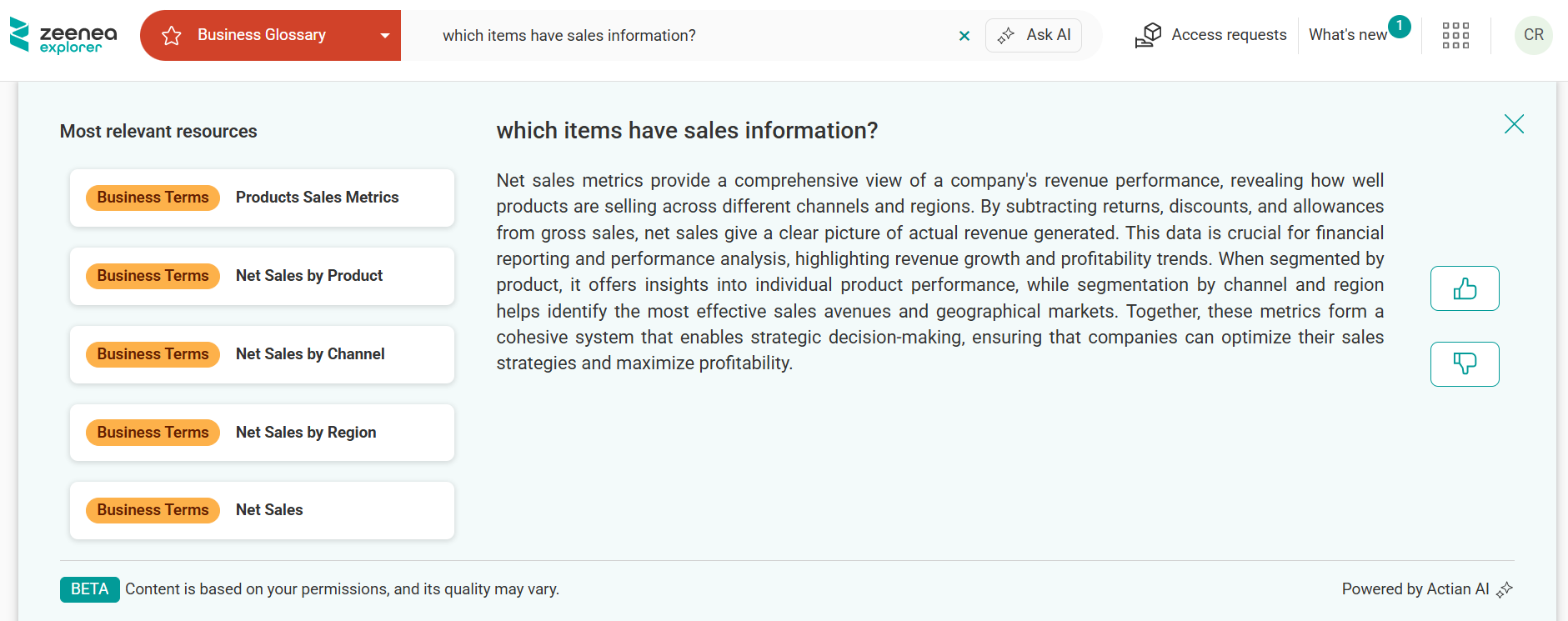 Ask AI combines advanced natural language processing with the semantic layer of the Actian Data Intelligence Platform to deliver intelligent search results: