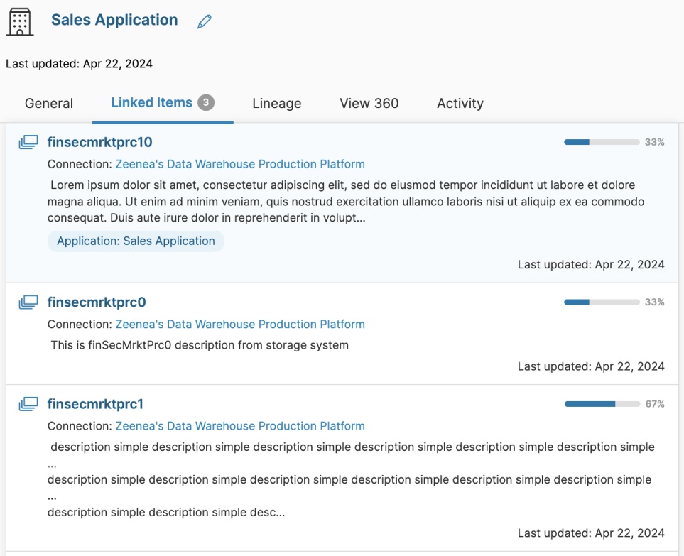 By accessing the detailed page of a specific custom item (for example, an Application), you may review all objects that Application is linked to: