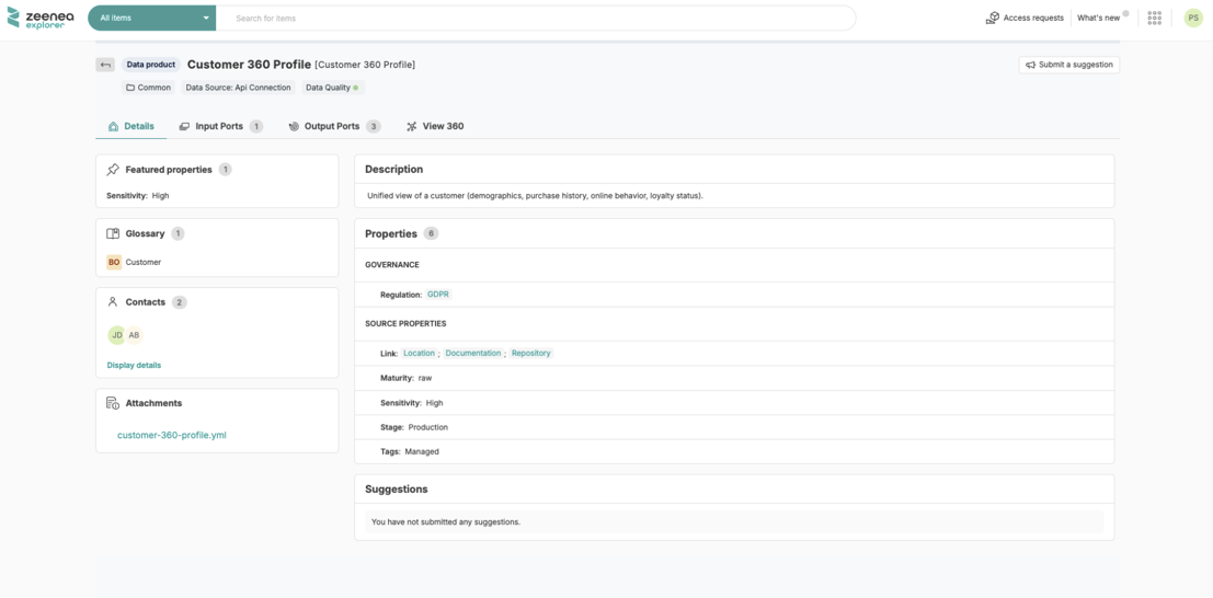 Data products and output ports are represented as two built-in item types. You can manage their templates and responsibilities as any other item type in the Catalog Design section. It allows curators to provide metadata in addition to that harvested from the source with the API.