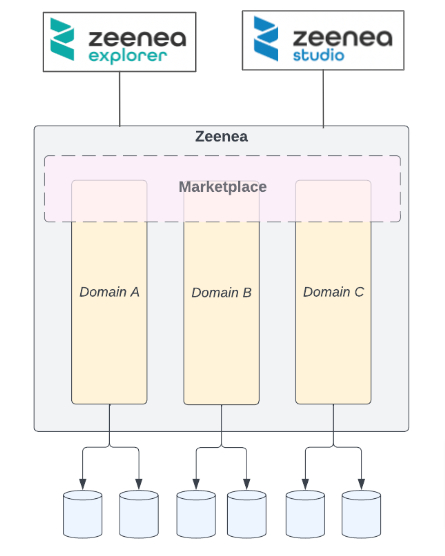In the federated catalog or EDM, Zeenea Studio remains the back-office tool and Zeenea Explorer is the e-commerce-like front-end that enables end-users to search and discover in a single interface not only the whole data landscape of his domain but also the data products or assets shared by other domains in the marketplace.