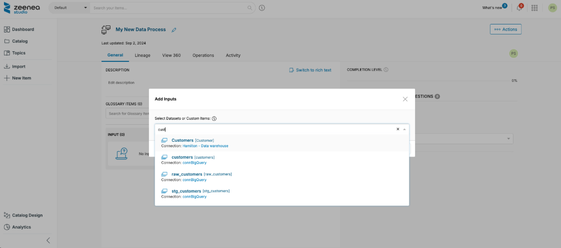 Search for Datasets (already imported in the catalog) or for Custom Items to link them to the Data Process.