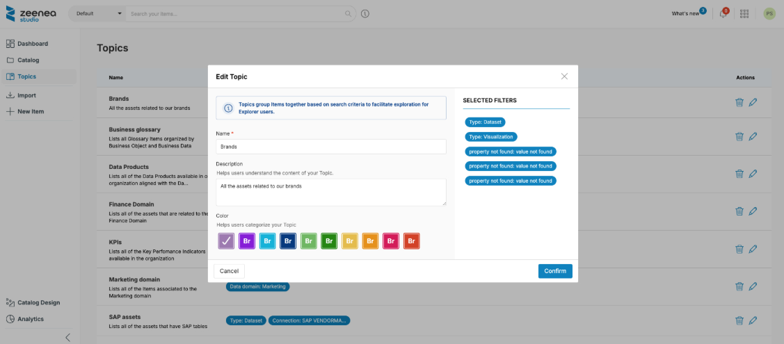 Note: The filters of the Topic cannot be modified. You can only modify the name, description, and color of a Topic.
