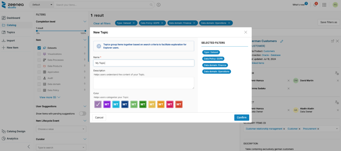 Color: The selected color will be applied to the Topic to give a visual cue to business users and help them find their way through the list