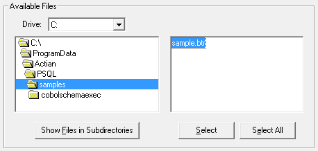 In the Available Files area, navigate through the folder hierarchy to locate files to monitor. Only files in Btrieve format will be listed. You may also use the Show Files in Subdirectories button to display a list of all Btrieve files from the current directory downward.