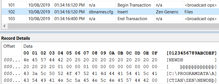 One type of Btrieve file other than a data file that you may want to monitor is the Zen server system file dbnames.cfg, found in a default installation under C:\ProgramData\Actian\Zen. It is the master list of Zen databases and their configuration settings. You may find it useful to audit it for changes such as new and dropped databases, which appear as inserts and deletes in the dbnames.cfg file. Because dbnames.cfg is a Btrieve file with no schema, its audit records are not human readable. However, they reveal text strings that provide the name and location of the database, as shown in the following example: