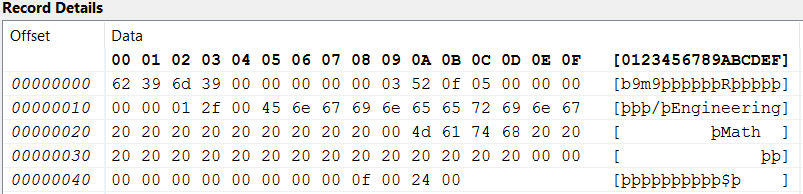Without DDFs, data records captured from monitored files appear as hexadecimal rows, and you cannot query on specific data values. Lacking DDFs to format the display of a logged record, AuditMaster displays the insert of a record in a data file something like the following: