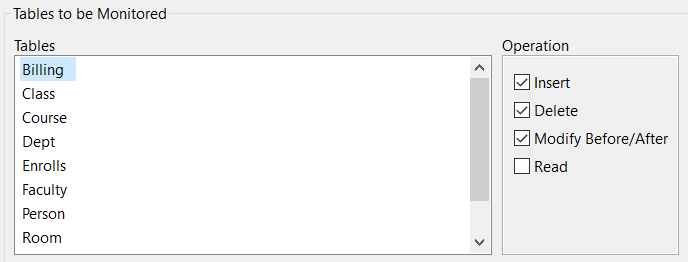 In the Table Group or Btrieve File Group window, each table or file in the group has a list of operations that can be monitored. Clicking a table or file displays the operations monitored for that item. Occurrences of selected operations produce audit records. For example, when the Insert operation is selected, any successful insert into the monitored table or file, regardless of the method of insert, generates an audit record.