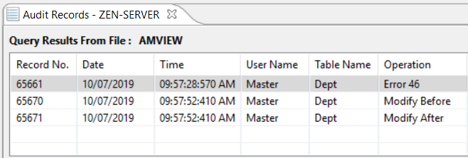 The following example shows an audit record captured when status code 46 is selected to be audited. The location of the error is the Demodata table Dept, which has been added to a group to be monitored. Status code 46 indicates an invalid owner name, which results here from an attempt to update the table using an incorrect owner name. The update operation produces no audit record because it failed. A second attempt to update the file, this time with a valid owner name, allows the update to succeed, resulting in the Modify Before and Modify After audit records.