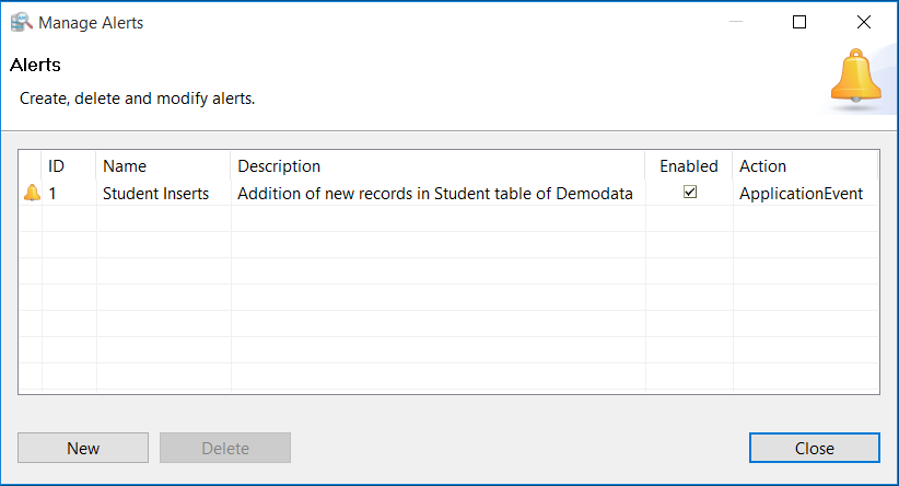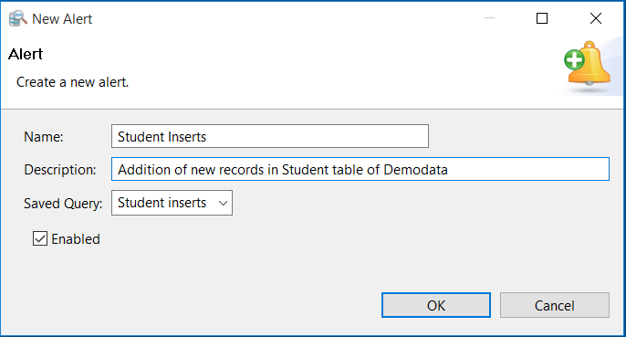 • Selecting the Enabled check box activates the alert. Clearing the check box deactivates it, meaning that no audit record matching the query can trigger an alert. As a result, no bell icons will be shown for these audit records in any query result, and no entry will be written to the Windows event log.