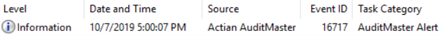 In addition to flagging the audit record, AuditMaster writes an entry to the Windows Application log in %SystemRoot%\System32\Winevt\Logs\Application.evtx. When displayed in Windows Event Viewer, the log entry resembles the following: