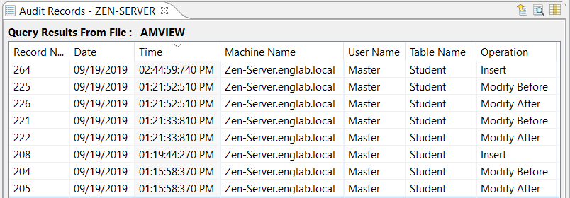 To display audit records from a current view or archive file, you must run a query. By default, the query returns all available audit records associated with tables or data files monitored in audit configurations. You can restrict the query using search conditions for