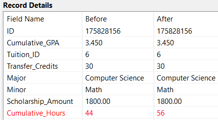 To see the detail of an individual audit record, click the record in the Audit Records tab to display it in the lower part of the AMCC window. If the audit record captures changes to an application data record, both before and after values are shown and highlighted in red.