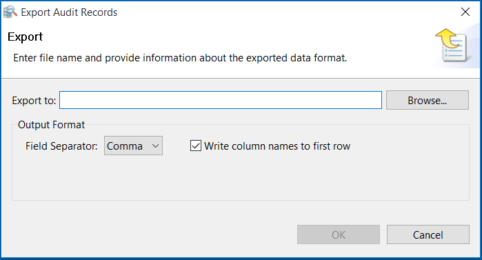 AuditMaster can export the displayed contents of the Audit Records or Status Log tab to a comma- or tab-delimited text file.