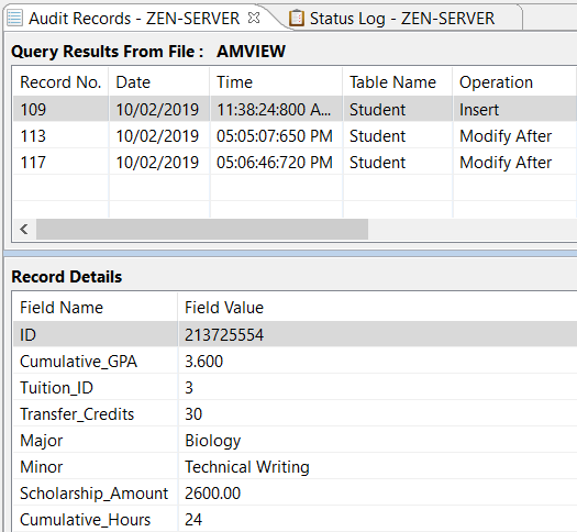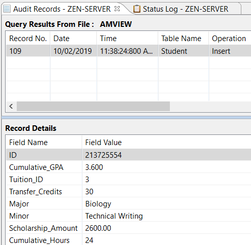 As shown in the following information for this event log entry, the data detail from the Zen database record is the same as that shown for the audit record in AMCC: