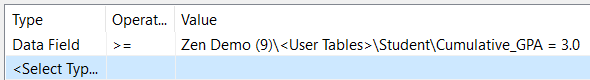 6. For the Data Field operator, select >= for greater than or equal to 3.0.