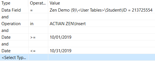 • Under Did What, only Zen database operations and selected Zen status code messages are selected for the query. AuditMaster internal and debug messages are not selected.