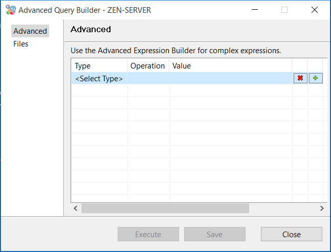 In this window, the Advanced group of query options is selected by default and is used here. The Files group is explained under
