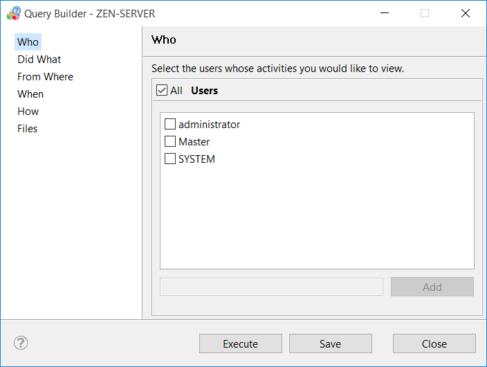 Query Builder provides sets of search conditions for restricting a query to who, did what, from where, when, how, and in which files of audit records to search.