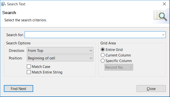 • In the Direction options, select a direction to start the search. These include, From Top row down, the Next row down, and the Previous row down.
