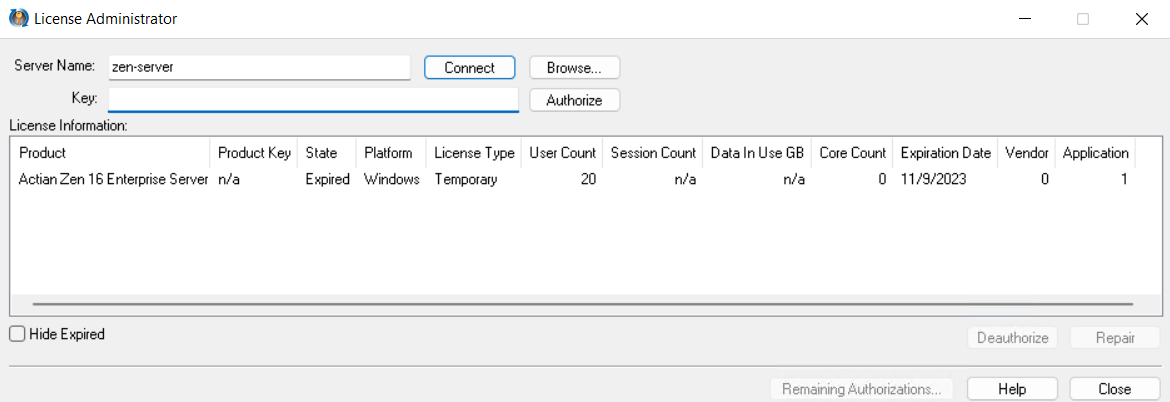 Actian Zen 16 Enterprise Server n/a Expired Windows Temporary 20 n/a